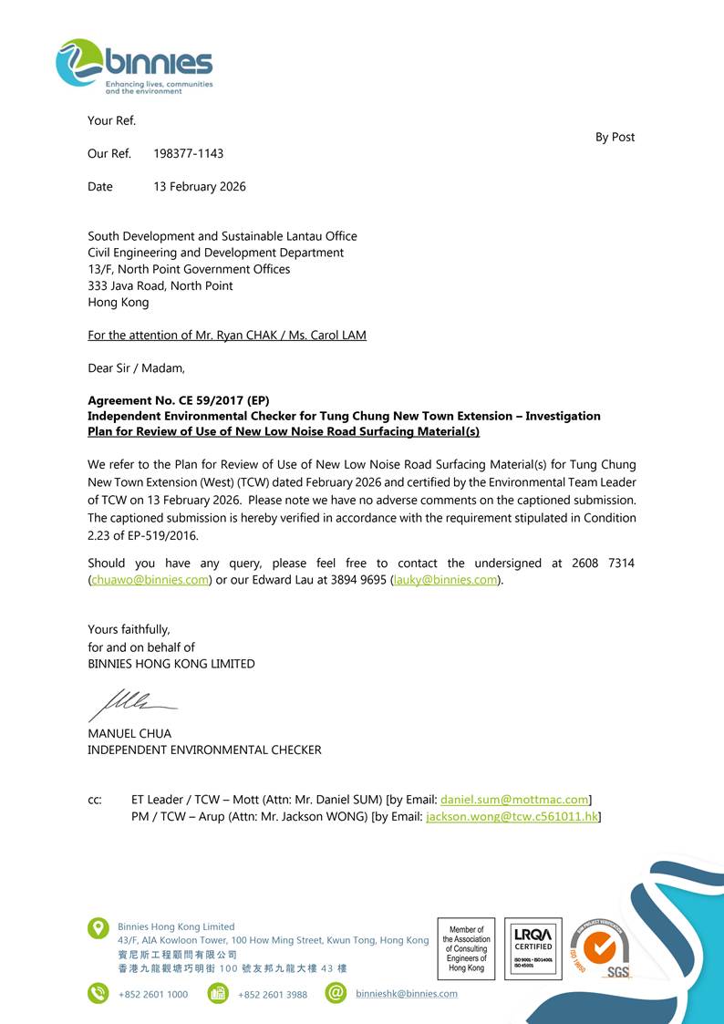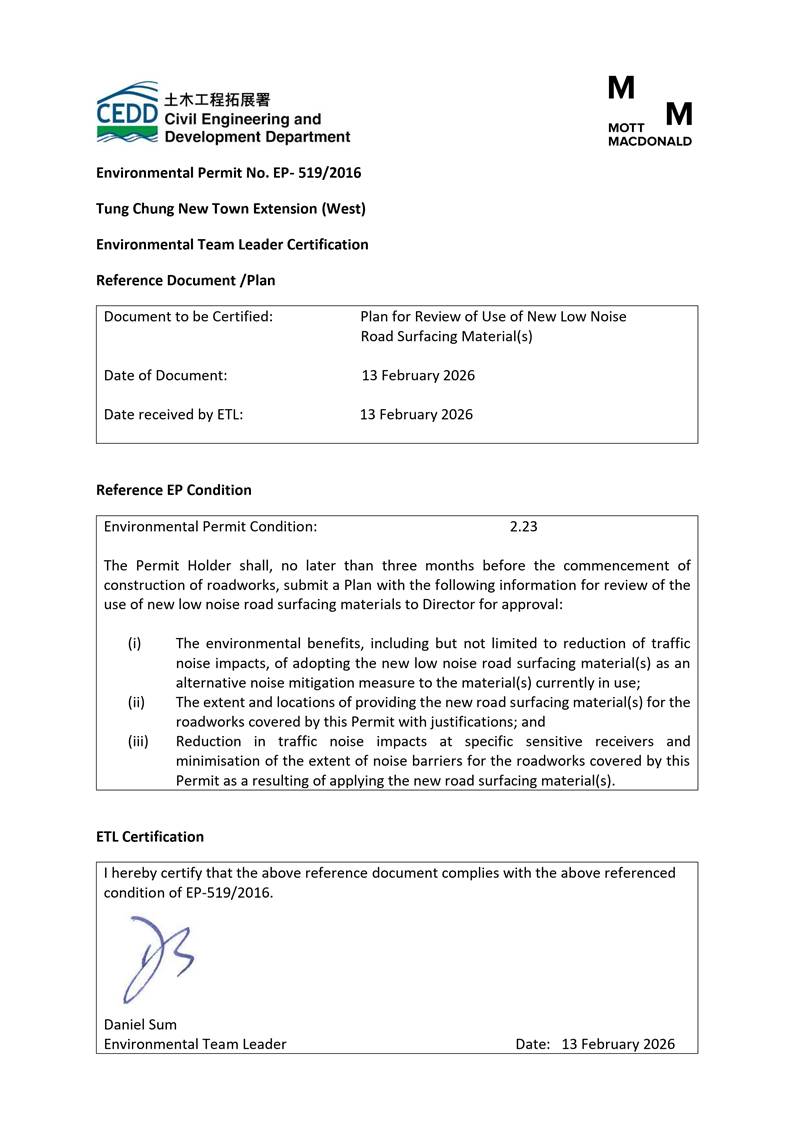 This Plan only covers the details of the use of new low noise road surfacing material(s) (LNRS materials) for Tung Chung West (TCW). For the review in Tung Chung East (TCE) area, if applicable, it will be covered by separate submission(s).