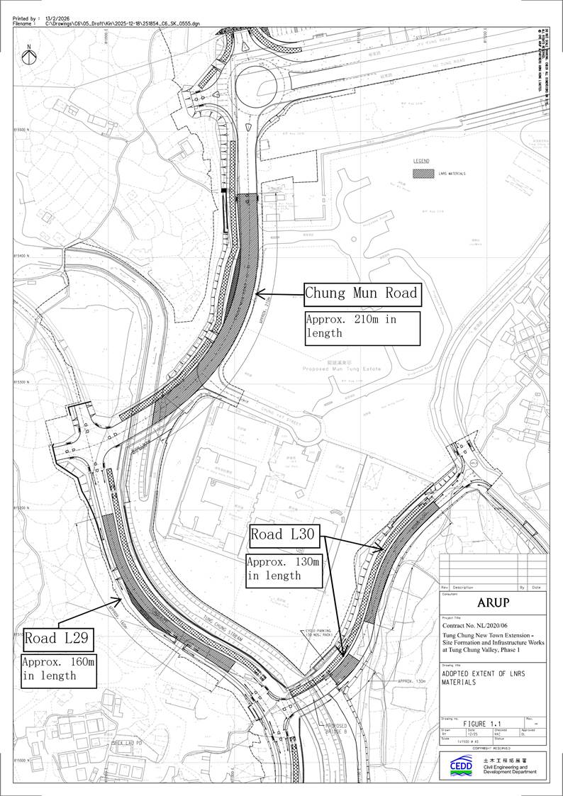 It is recommended the use of the HMSMA6 as LNRS materials for this project. According to the approved EIA Report (Section 4.5.4) (relevant figures extracted in Appendix A) and Environmental Permit (EP) (EP No. EP-519/2016) (Figure 2) (extracted in Appendix B) for TCNTE and the agreement in the inter-departmental meeting as stated in Section 1.1.3the extent and locations of LNRS materials for the roadworks are shown in Figure 1.1, which are confirmed by CEDD. The adoption of LNRS materials are approx. 210m long along Chung Mun Road, approx. 160m long along Road L29 and approx. 130m long along Road L30. The proposed extent of LNRS is fully compliant with the at-source mitigation measures recommended in the road traffic noise impact assessment in the feasibility study as mentioned in Section 1.2.5.