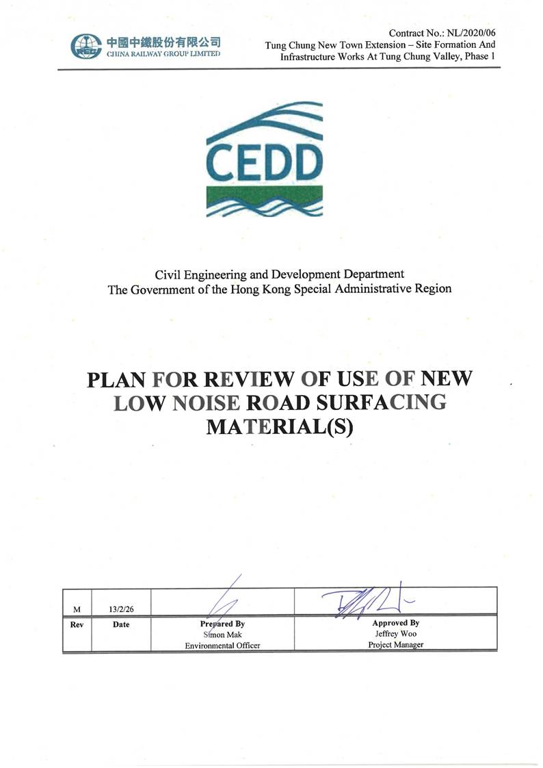 This Plan only covers the details of the use of new low noise road surfacing material(s) (LNRS materials) for Tung Chung West (TCW). For the review in Tung Chung East (TCE) area, if applicable, it will be covered by separate submission(s).